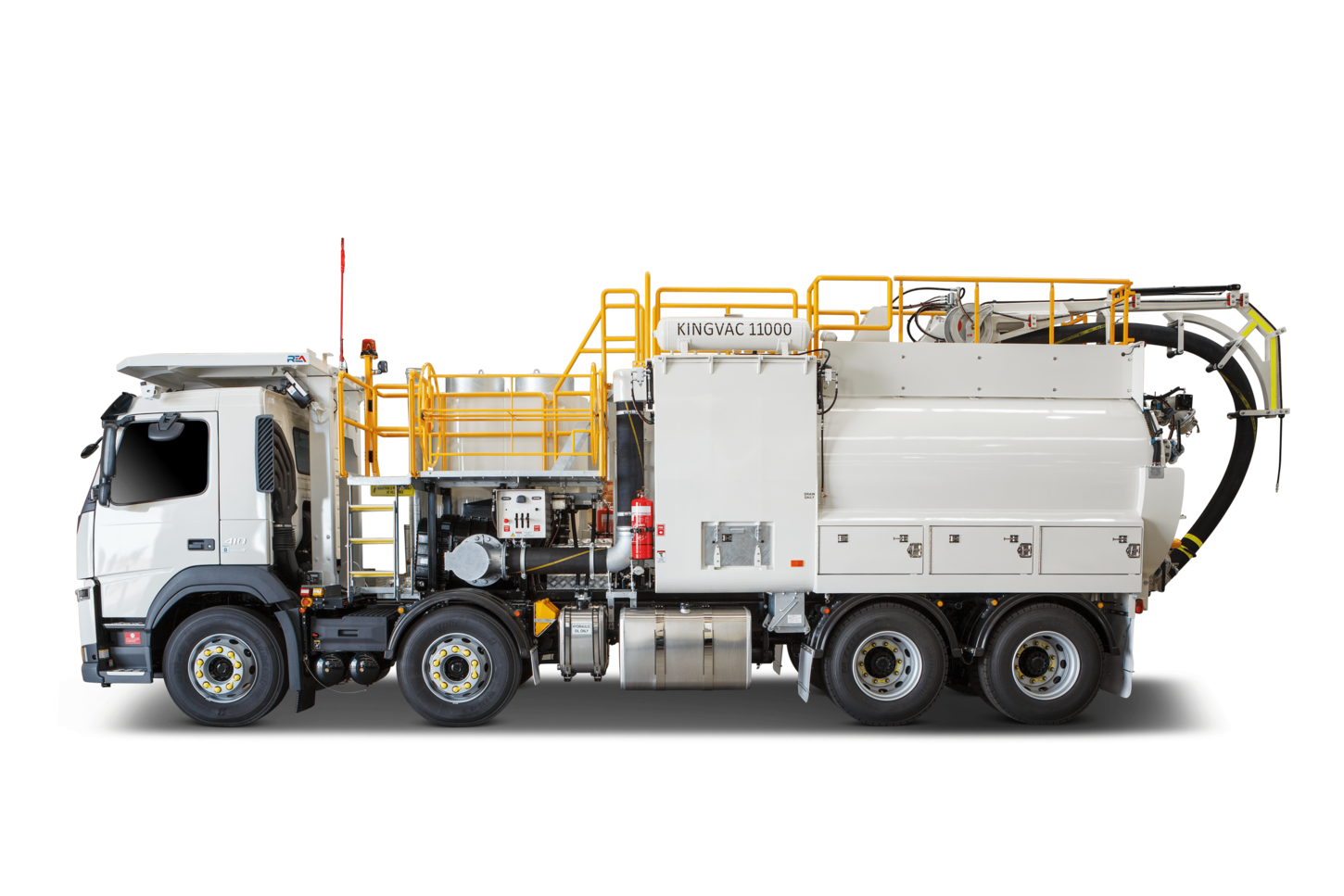 The KINGVAC 11000 is designed with safety in mind. All rotating shafts are covered. Many safety features are used including emergency shutdown, overfill protection, electrical isolation units, braid-covered cables, moisture-sealed electrical plugs and sockets, sealed control cabinets, slowed hydraulics, control interlocks, a remote emergency button on a cord and more. Vacuum stops trigger a relief valve on the tank.